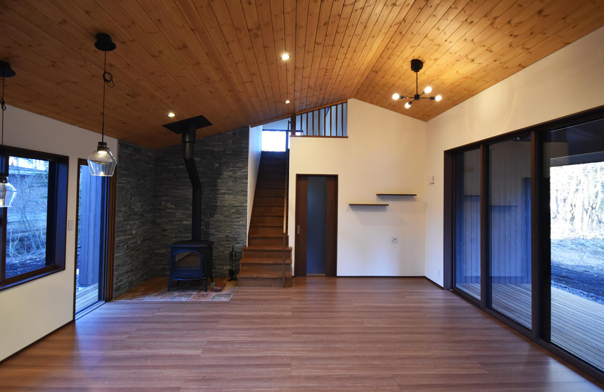 パイン材の天井板と薪ストーブが別荘らしいくつろぎの空間にしています。